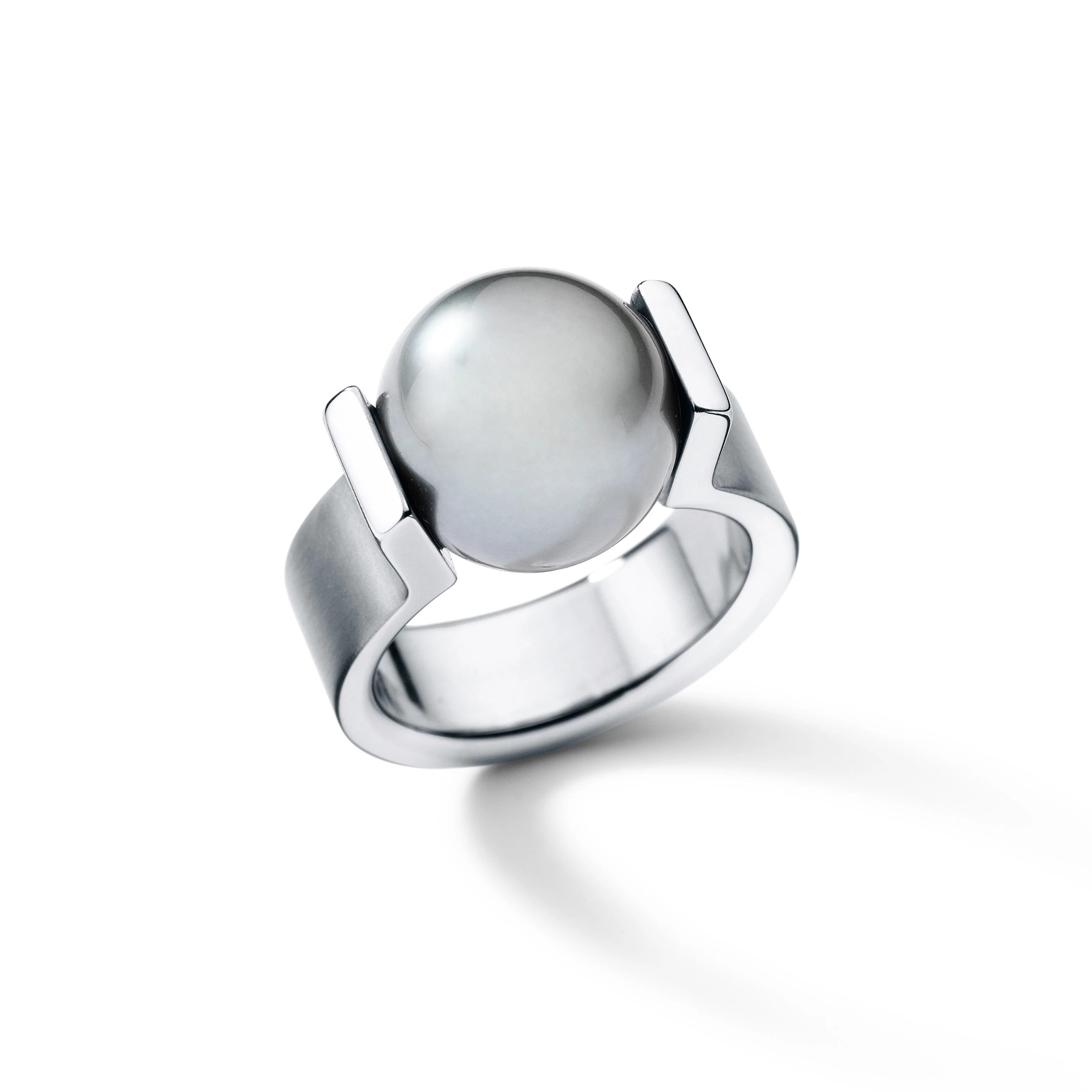 Die Seiten- und Innenflächen des Ringes sind poliert, die Außenfläche ist mattiert, die Kanten sind gerundet, so fühlt sich der Ring weich und geschmeidig an. Humphrey verwendet Tahitiperlen von ausgesprochen hoher Qualität.